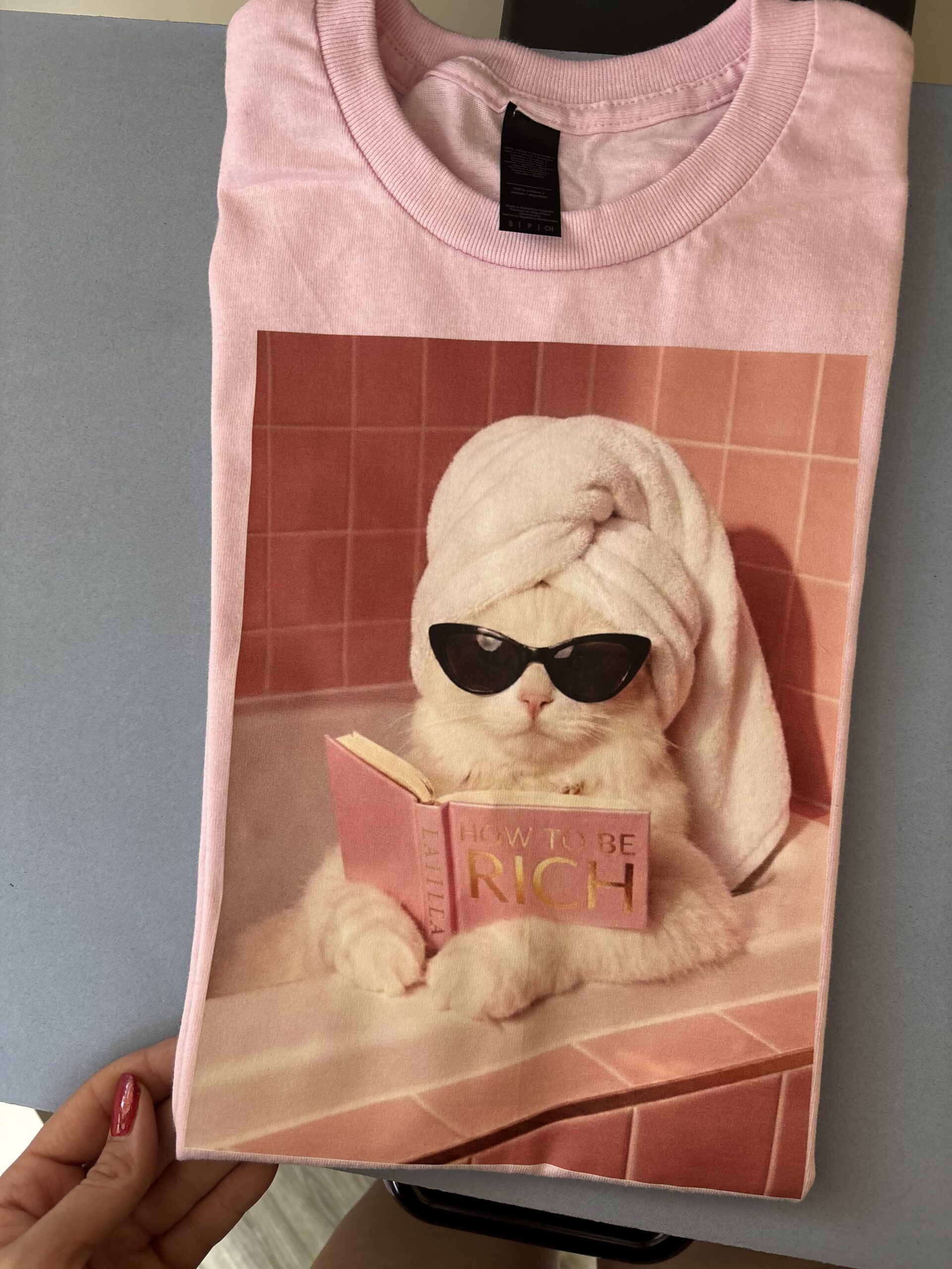 Od ręki - kot w wannie z książką - koszulka light pink - rozmiar S